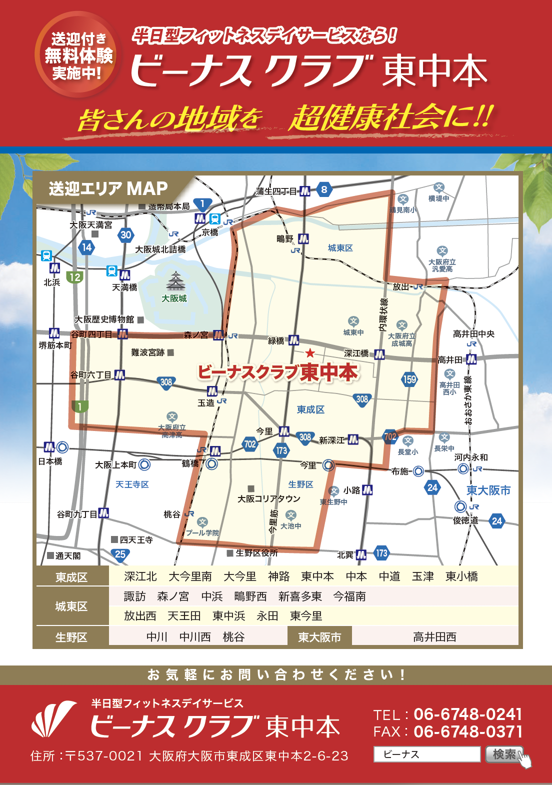 事業所送迎範囲を掲載したチラシです。送迎エリア地図(手書き原稿でもOK!)を送っていただければ、作成させていただきます。