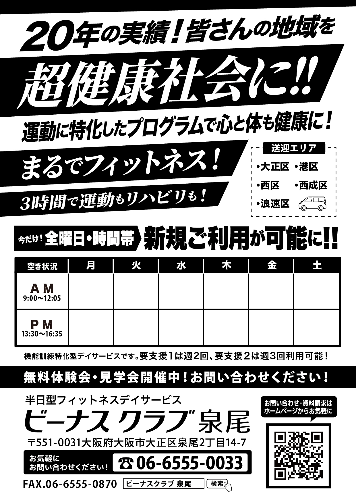 ビーナスクラブのスローガンを掲げ、サービス内容を訴求したFAXです。事業所の最新空き状況も入力し、送信していただけます!