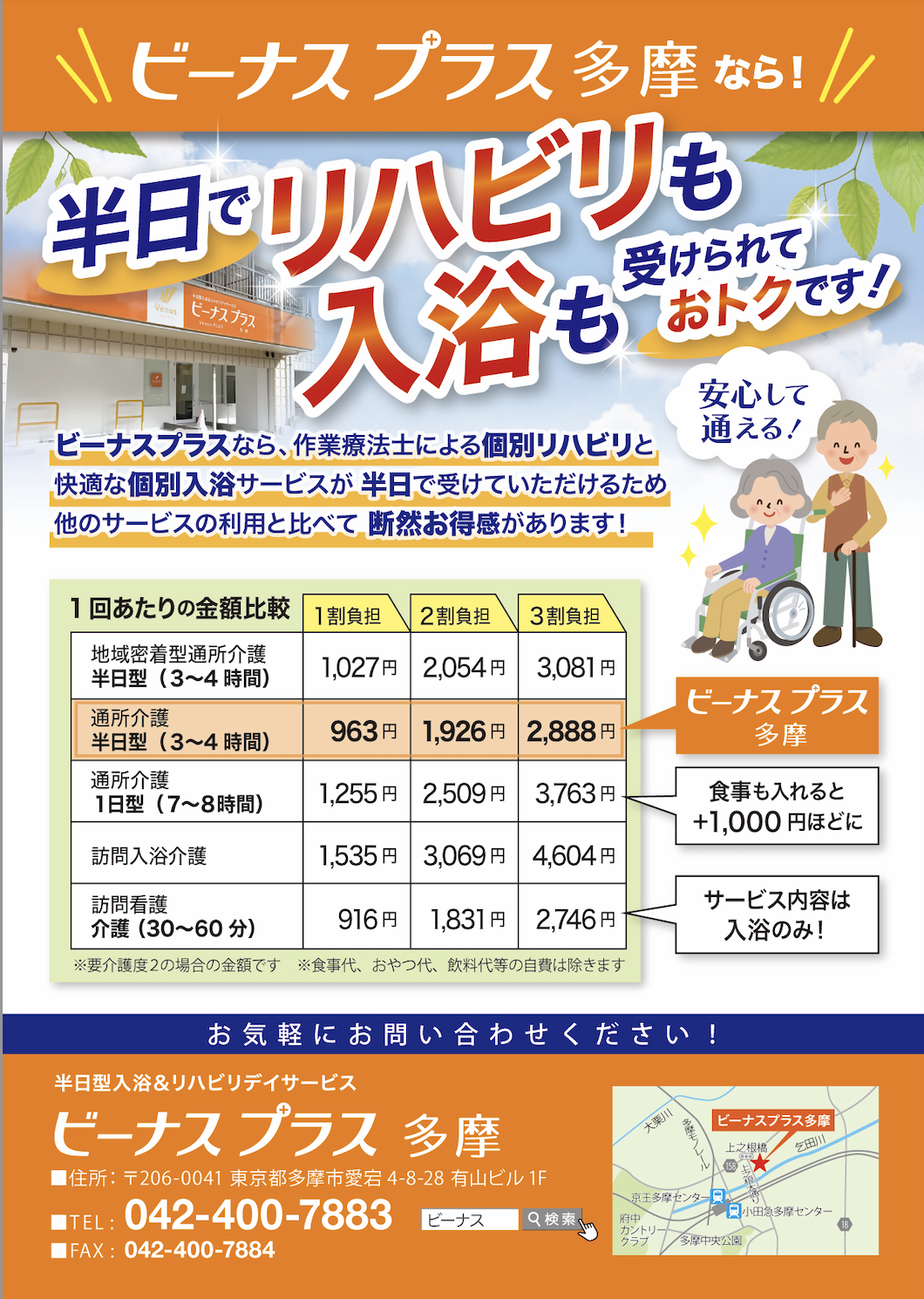 他の介護サービスとの料金比較を掲載し、半日でリハビリも入浴も可能なビーナスプラスのコストパフォーマンスの高さを訴求!