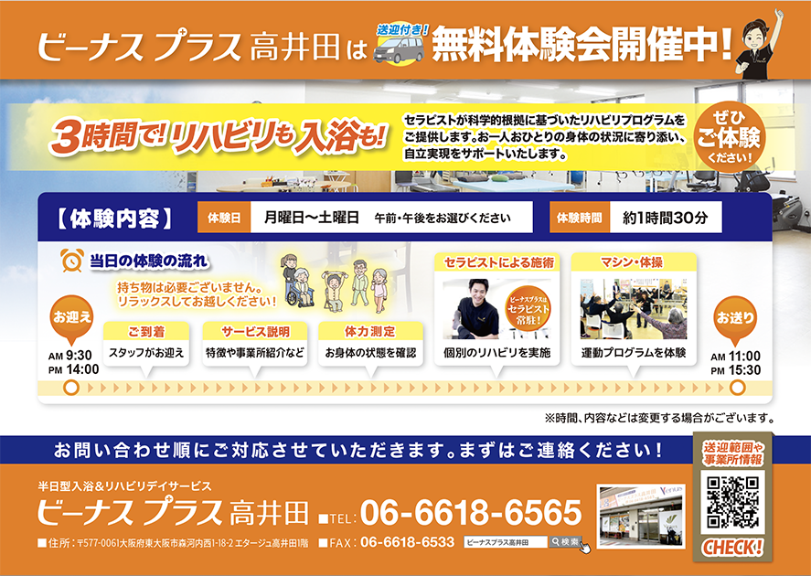『体験会ってどんなことをしているの?』と言った、ケアマネジャー様の声にお応えし、体験内容も掲載したチラシです。