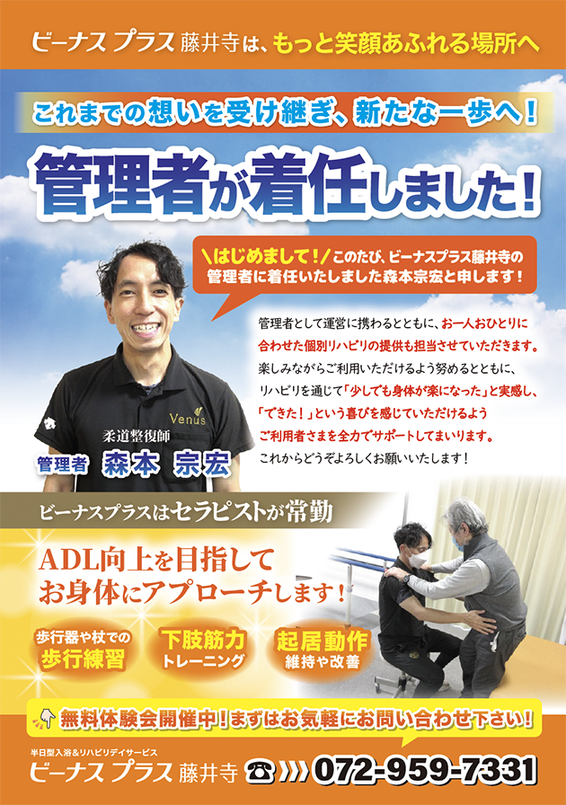管理者の変更を、新しいスタートとしてお知らせするチラシです。